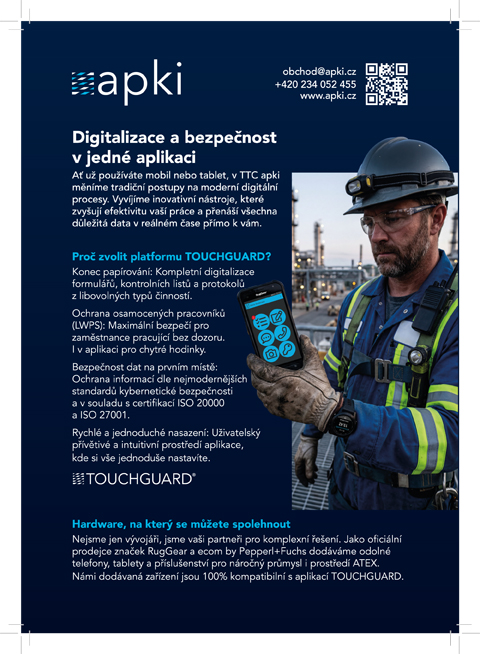 TTC apki, s.r.o.Digitalizace a bezpečnost v jedné aplikaciAť už používáte mobil nebo tablet, v TTC apki měníme tradiční postupy na moderní digitální procesy. Vyvíjíme inovativní nástroje, které zvyšují efektivitu vaší práce a přenáší všechna důležitá data v reálném čase přímo k vám. Proč zvolit platformu TOUCHGUARD? Konec papírování: Kompletní digitalizace formulářů, kontrolních listů a protokolů z libovolných typů činností. Ochrana osamocených pracovníků (LWPS): Maximální bezpečí pro zaměstnance pracující bez dozoru. I v aplikaci pro chytré hodinky. Bezpečnost dat na prvním místě: Ochrana informací dle nejmodernějších standardů kybernetické bezpečnosti a v souladu s certifikací ISO 20000 a ISO 27001. Rychlé a jednoduché nasazení: Uživatelsky přívětivé a intuitivní prostředí aplikace, kde si vše jednoduše nastavíte. Hardware, na který se můžete spolehnout Nejsme jen vývojáři, jsme vaši partneři pro komplexní řešení. Jako oficiální prodejce značek RugGear a ecom by Pepperl+Fuchs dodáváme odolné telefony, tablety a příslušenství pro náročný průmysl i prostředí ATEX. Námi dodávaná zařízení jsou 100% kompatibilní s aplikací TOUCHGUARD. www.apki.cz, obchod@apki.cz |